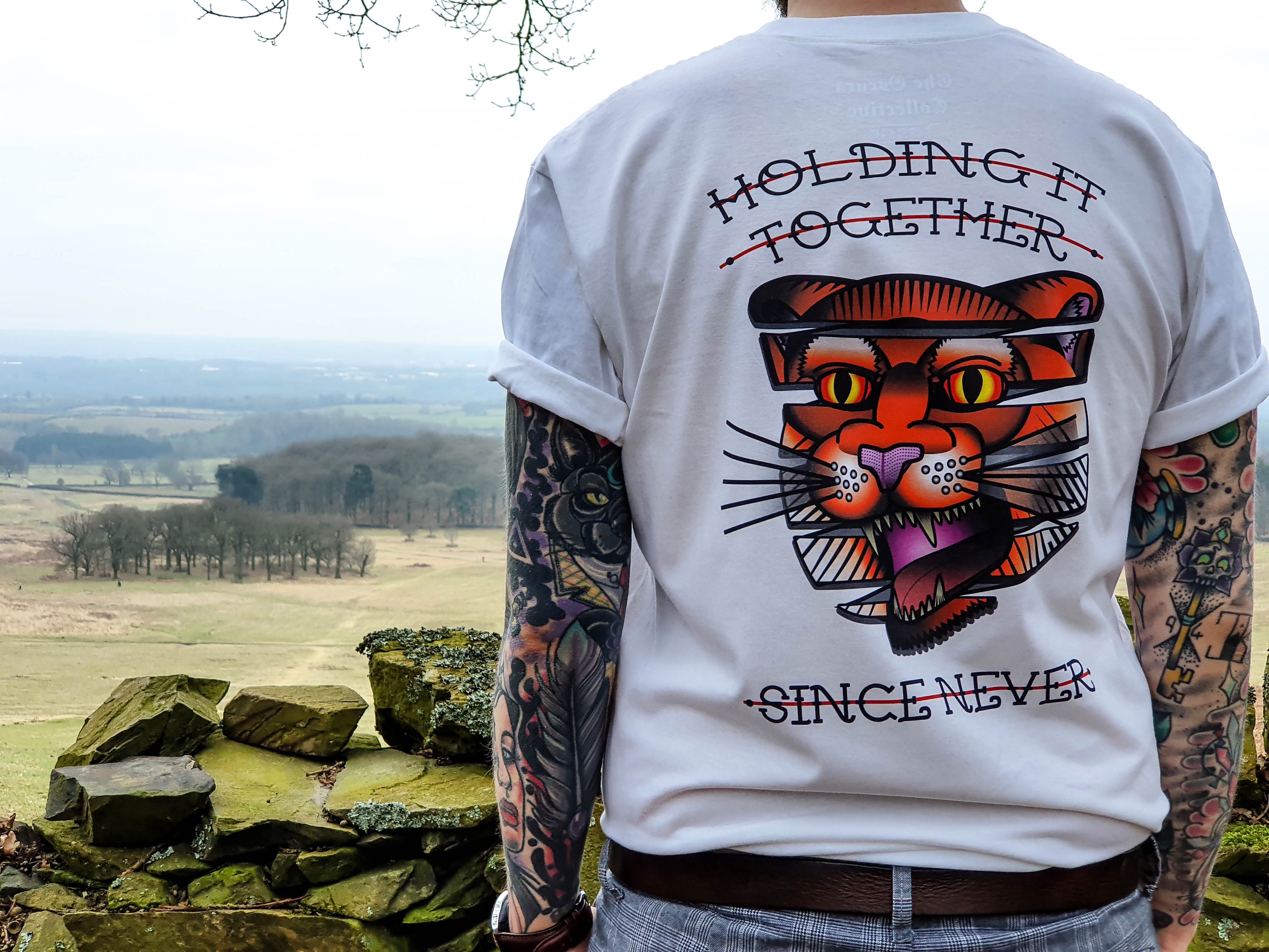 Embrace the raw intensity of struggle with our Holding It Together Since Never T-Shirt. This dark design features a tiger’s head slowly unraveling, symbolizing the constant battle to keep it all together amidst chaos. The powerful imagery conveys a profound sense of tension and fragility, all in a bold traditional tattoo style.