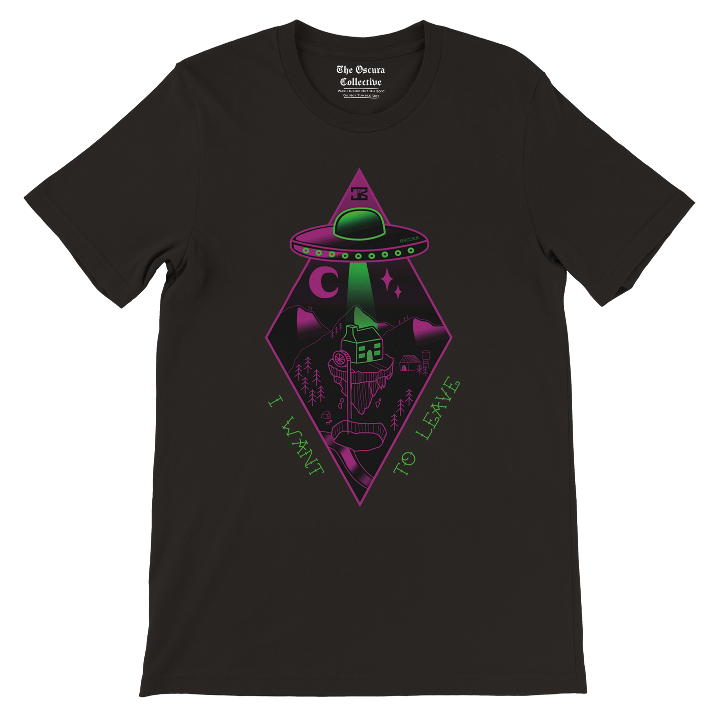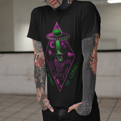 Break free from the chaos with our I Want to Leave T-Shirt. Featuring a neon-colored UFO abducting a farmhouse, this design captures the dark humor of wanting to escape our messed-up world. The vibrant, glowing colors contrast with the bleak reality we all wish we could leave behind.